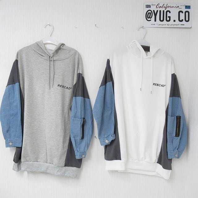 袖デニム切替 袖ZIPポケット 配色切替 パッチワーク パーカー プルオーバー グレー