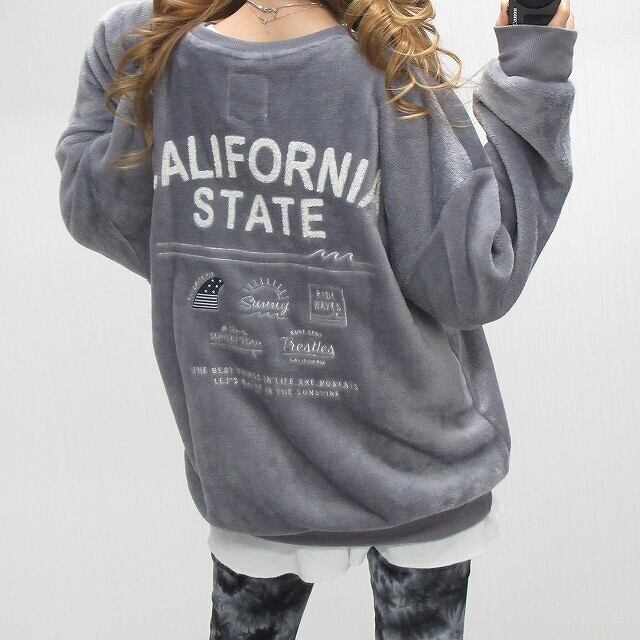 California サガラ刺繍ロゴ バック刺繍 ファーボア トレーナー プルオーバー ブルーグレー