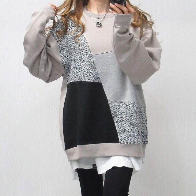トレーナー地×MIXニット&ニットの異素材MIXのパッチワーク 配色切明デザインがオシャレ感抜群!!