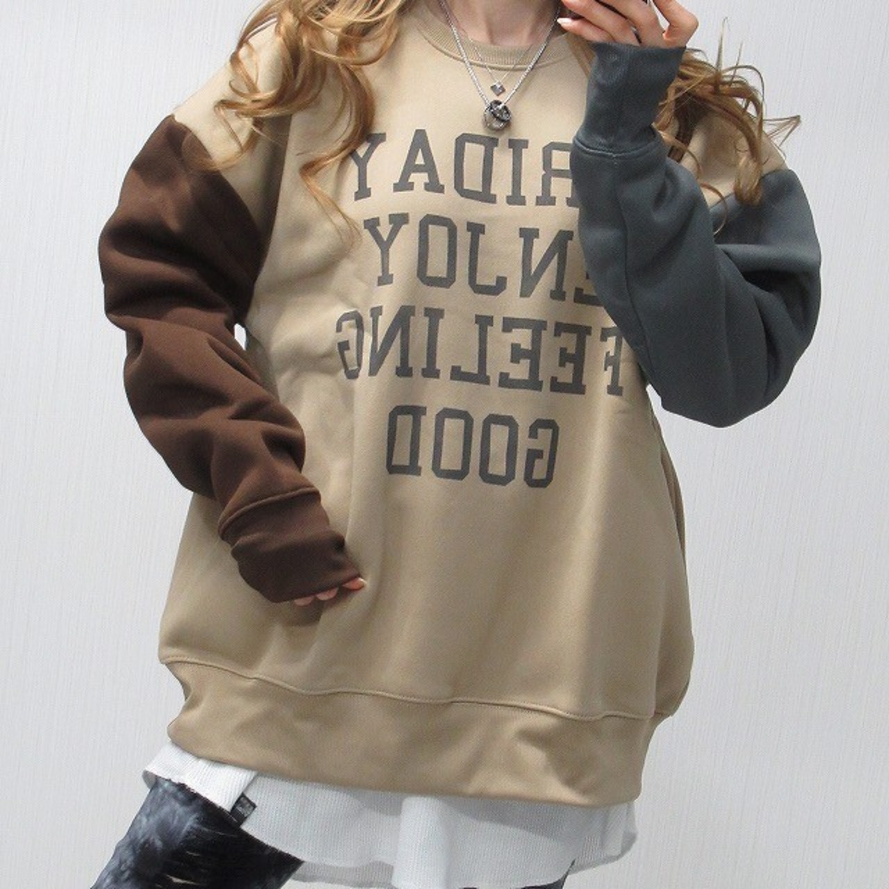 袖 配色切替 カジュアル 裏起毛 Frontロゴ BIGトレーナー プルオーバー ベージュ