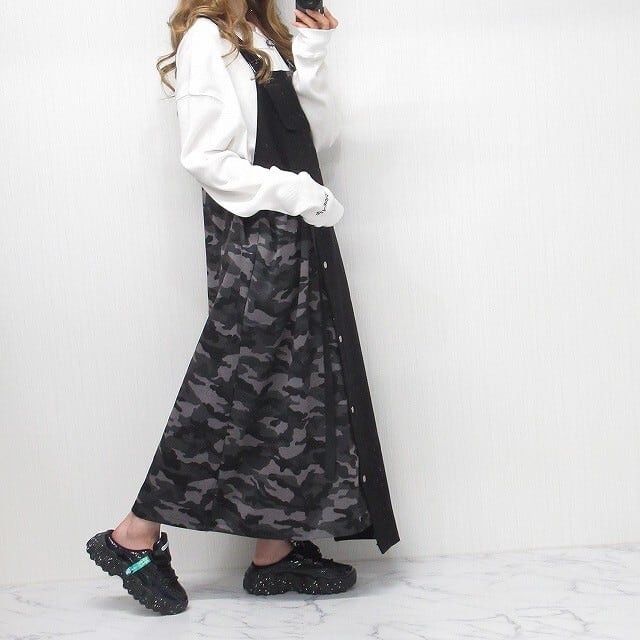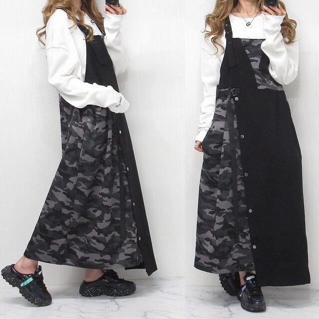 カモフラ 迷彩 切替 パッチワーク風 アシメ スウェット サロペ マキシワンピース