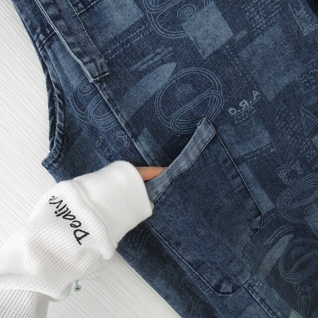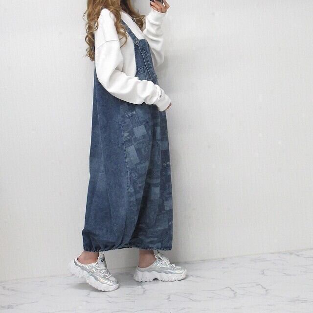 デニム ビンテージ ロゴ 切替 パッチワーク風 バルーン サロペ マキシワンピース