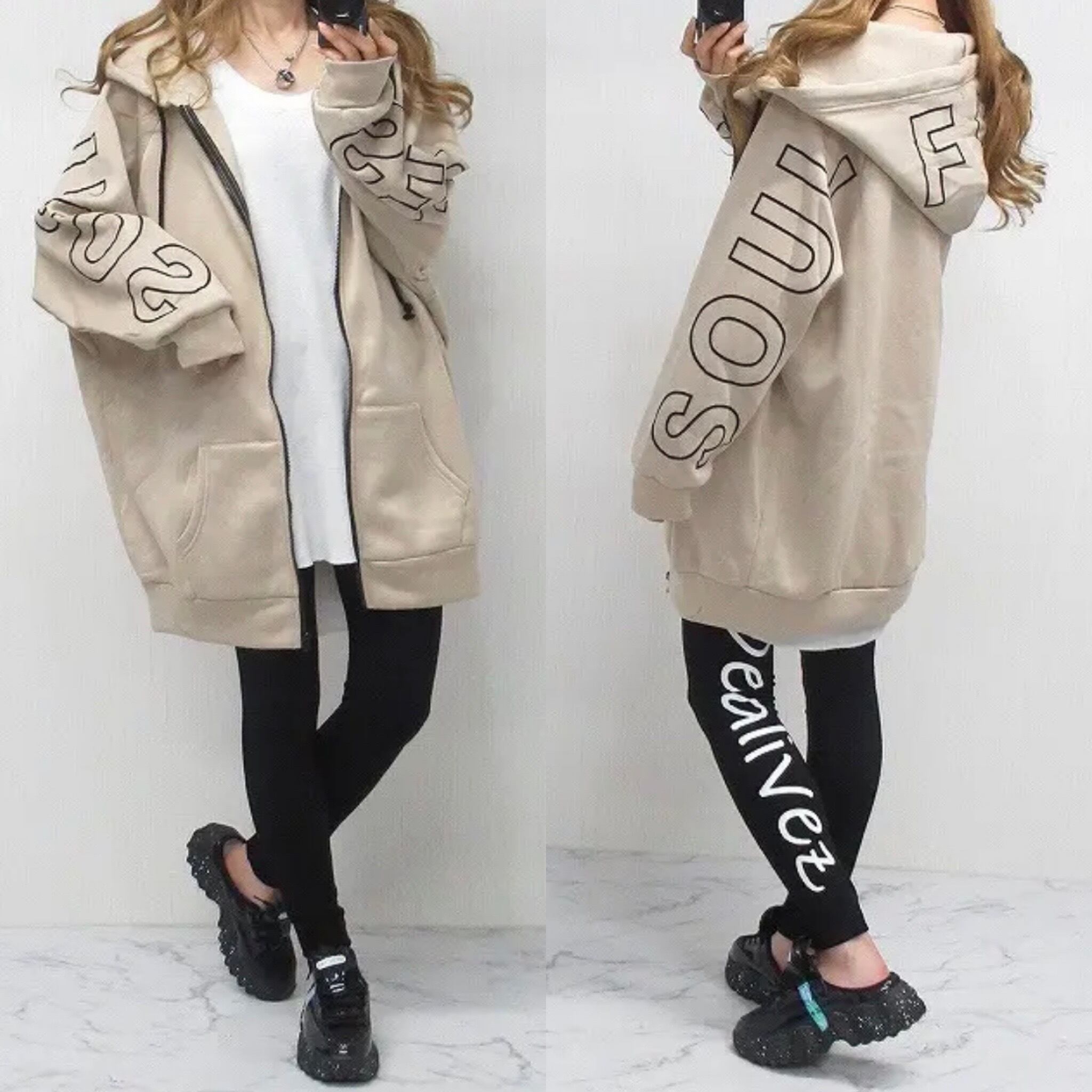 バックロゴ 袖ロゴ フードロゴ 裏起毛 ZIPパーカー オーバーシルエット ベージュ