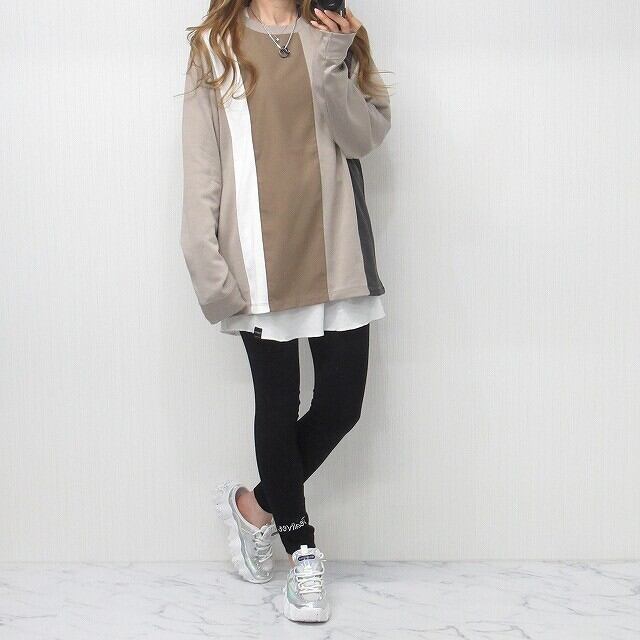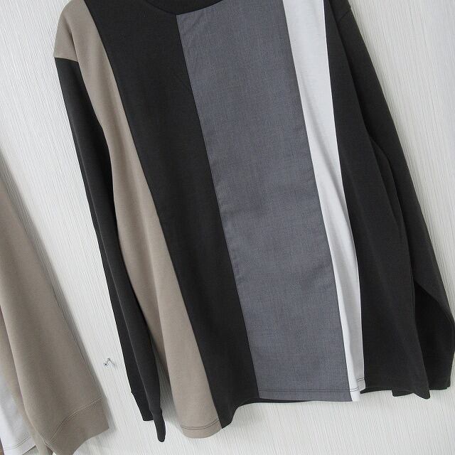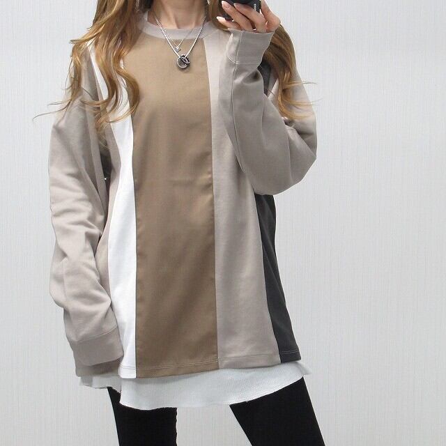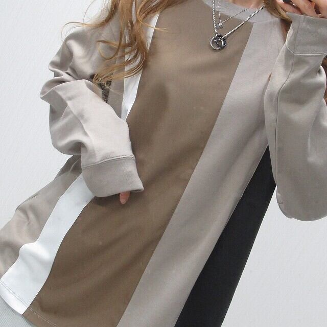 ストライプ柄 パネル配色 異素材MIX パッチワーク 切替 ロンT プルオーバー ベージュ