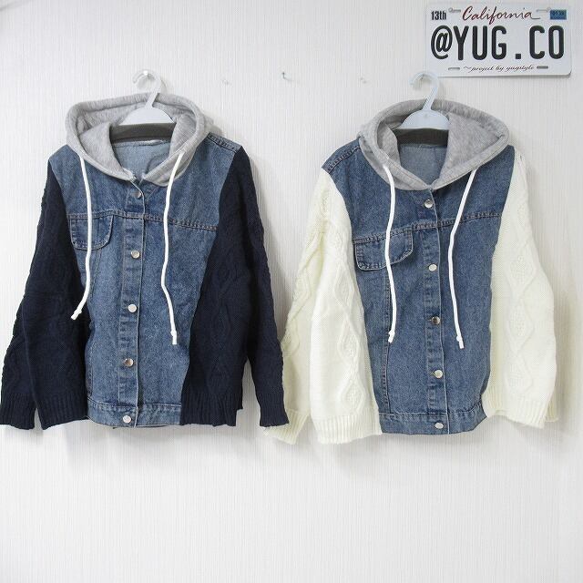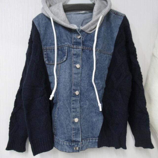 ざっくりニットがダイヤ柄編みで肉厚オシャレ♪切替デニム✖️フードはボリュームのスウェット生地でしっかりした作りのパーカージャケット ☆
