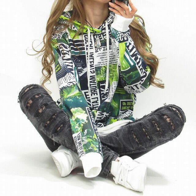 ストリート フォト&ロゴ総柄 ストリートパーカー オーバーサイズ ライム