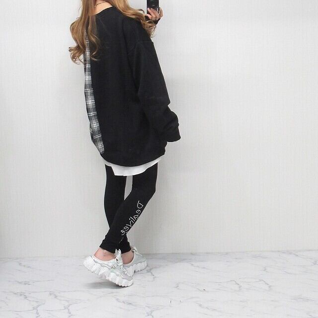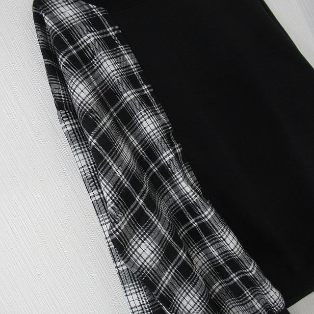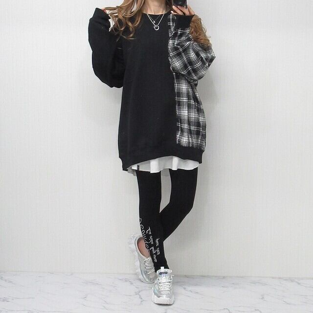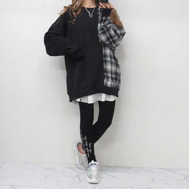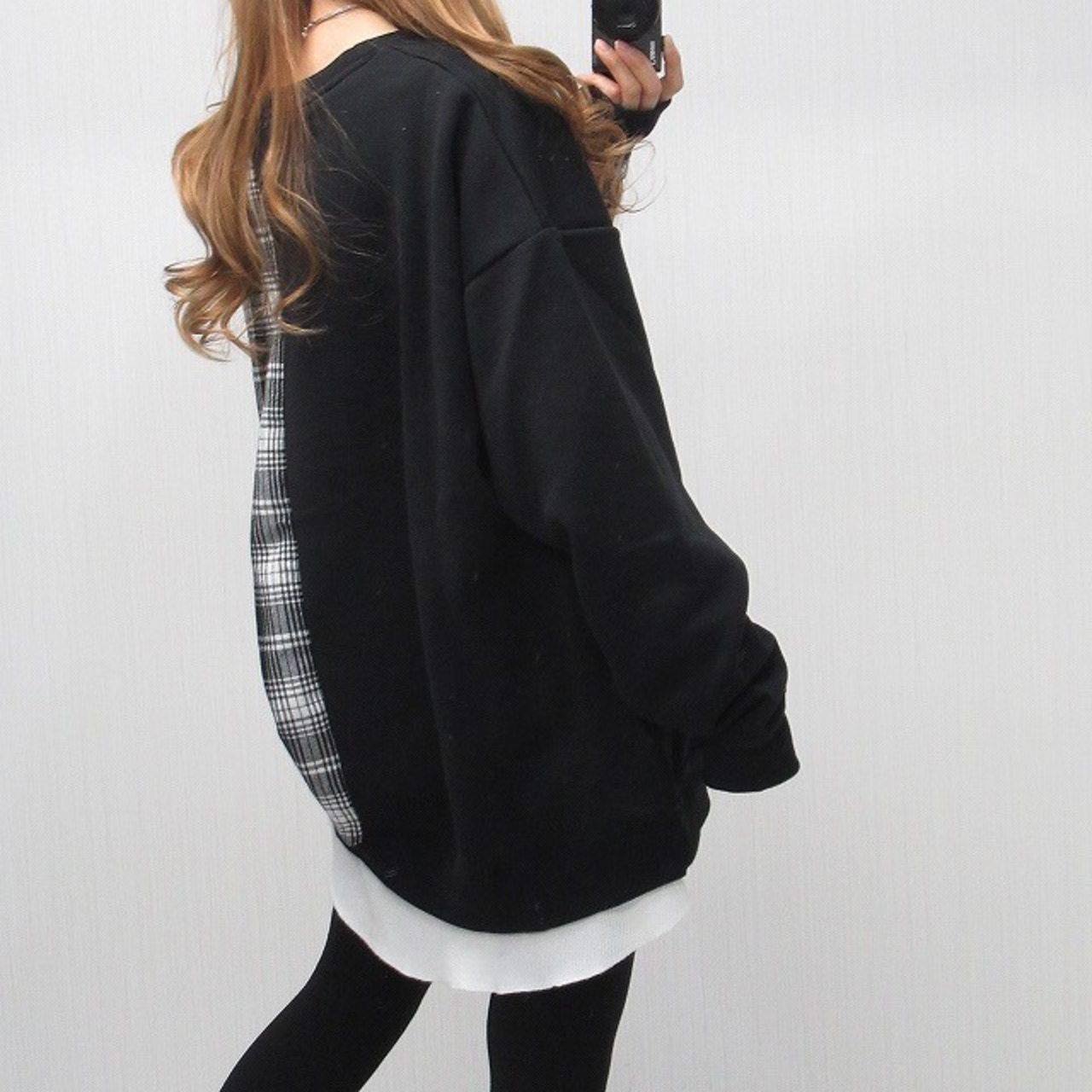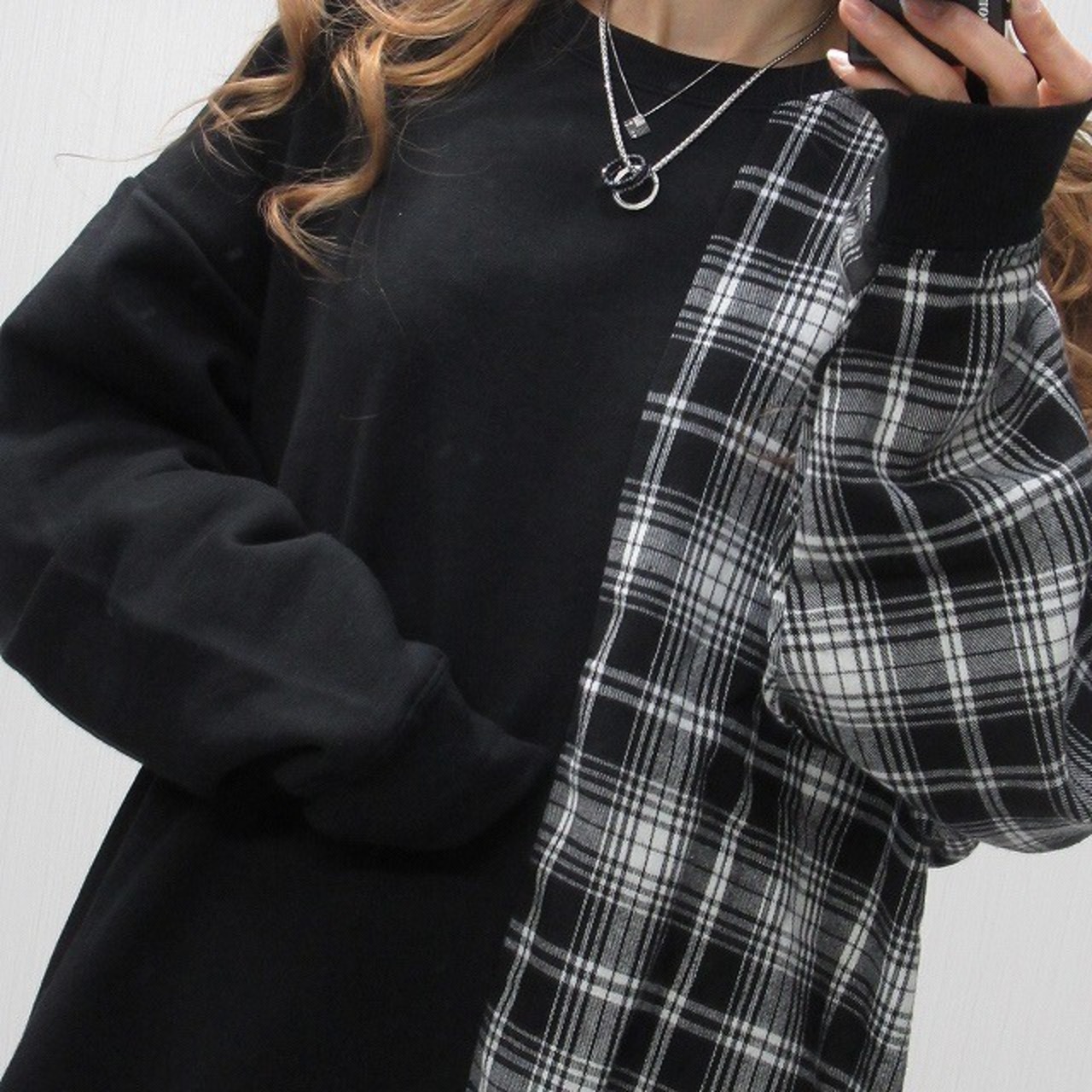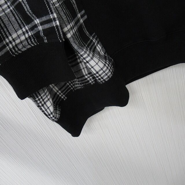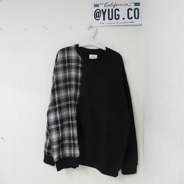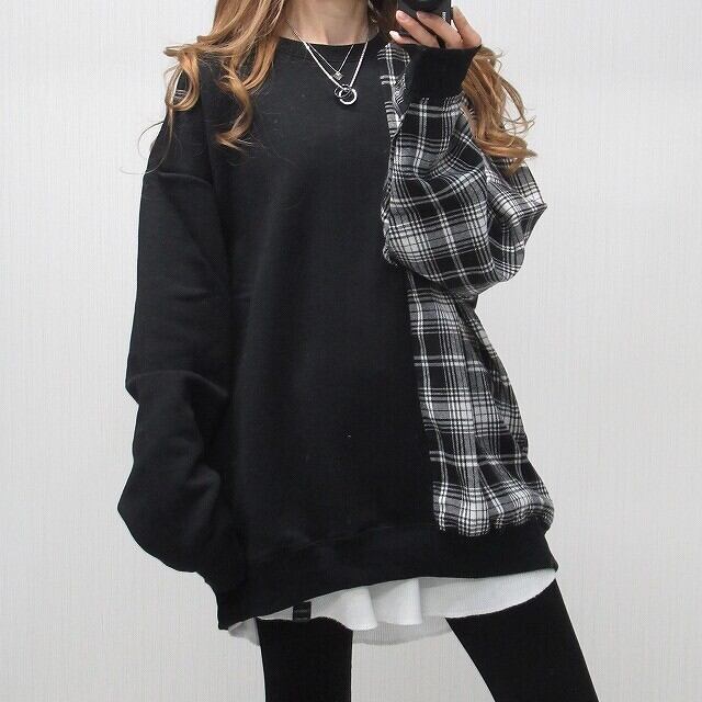 チェック柄シャツ ドッキング 裏起毛トレーナー BIGトレーナー プルオーバー ブラック