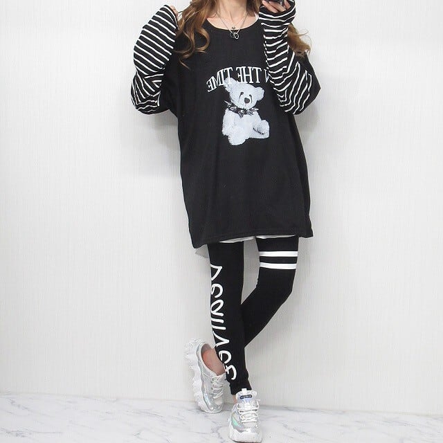 クマちゃん bear 袖ボーダー切替 レイヤード重ね着 ロンT オーバーシルエット