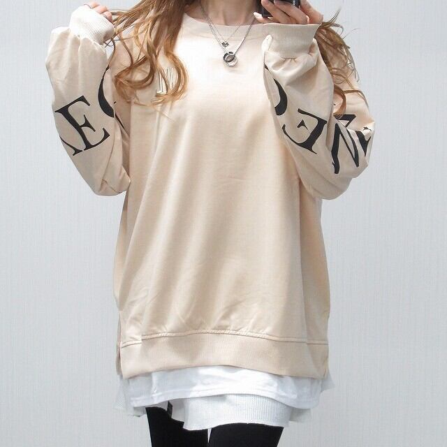 胸ロゴ刺繍 袖ロゴ 裾レイヤード 重ね着 トレーナー オーバーサイズ ベージュ