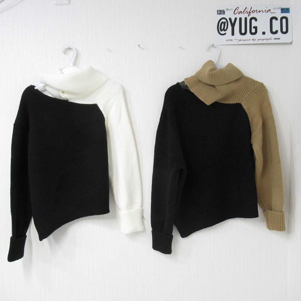 オフショル肌魅せ&ハイネック 2WAY バイカラー 肉厚 ゆるカワ ニット ホワイト