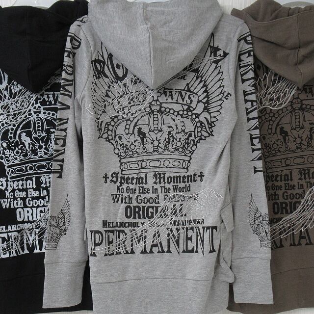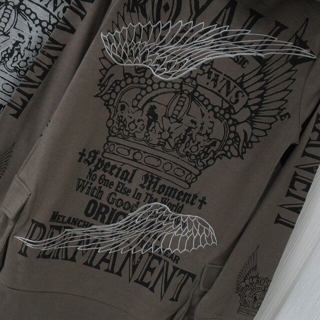 ウイング 翼 羽レース刺繍 タトゥ W襟&フード Side立体ポケット付 ZIPパーカー ブラック