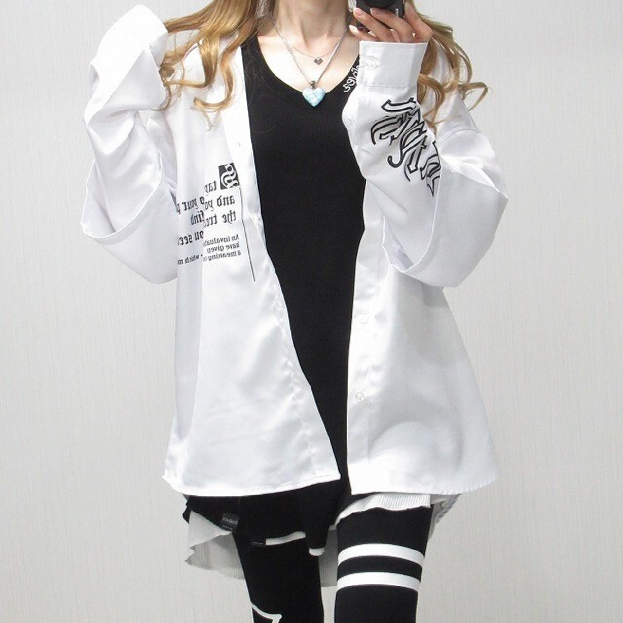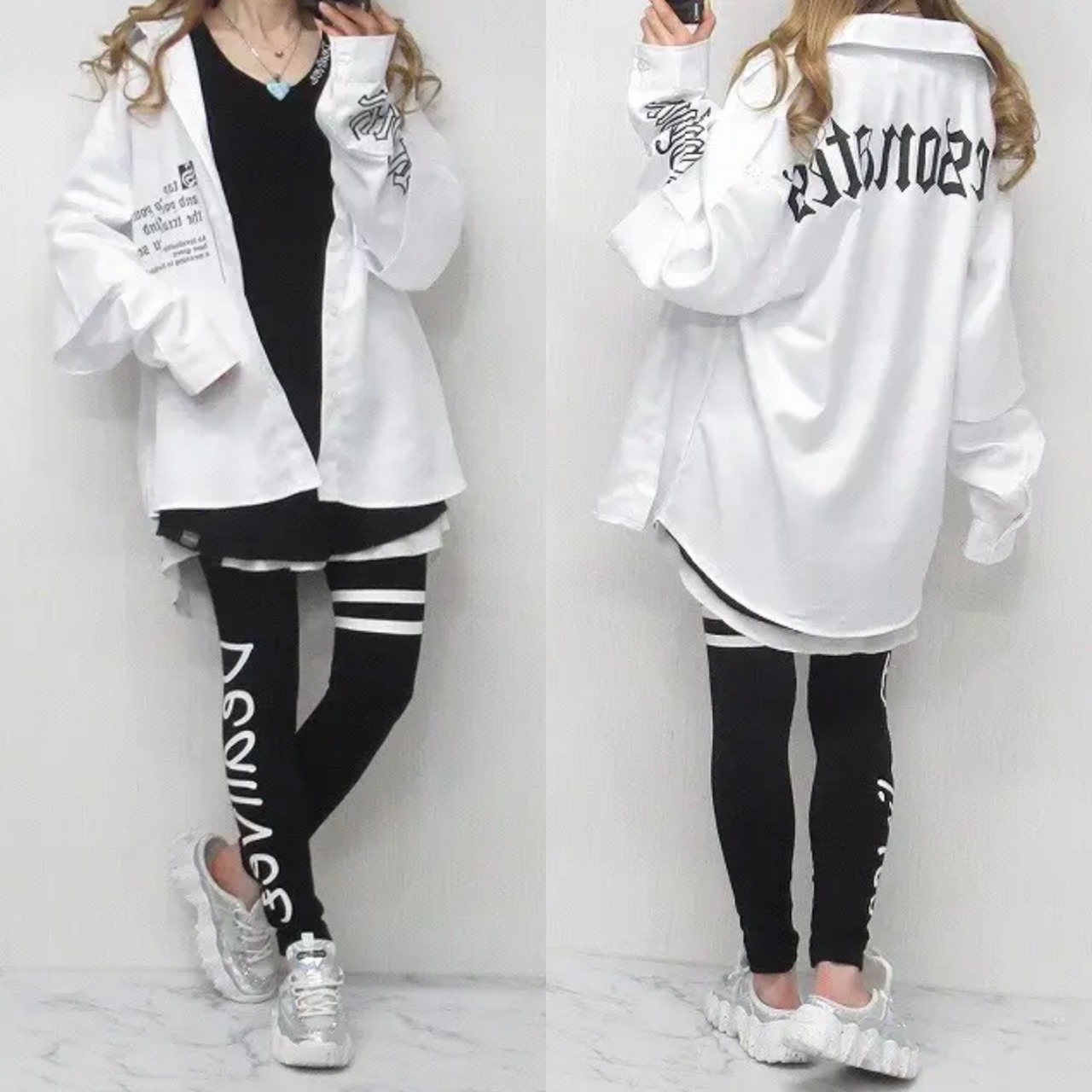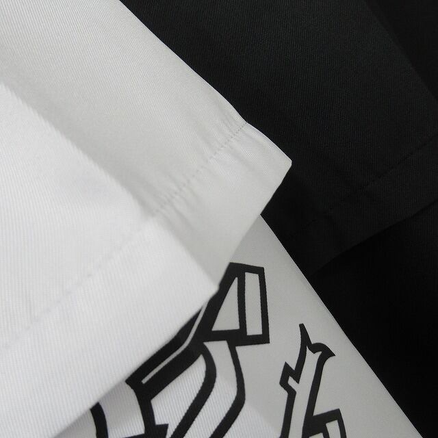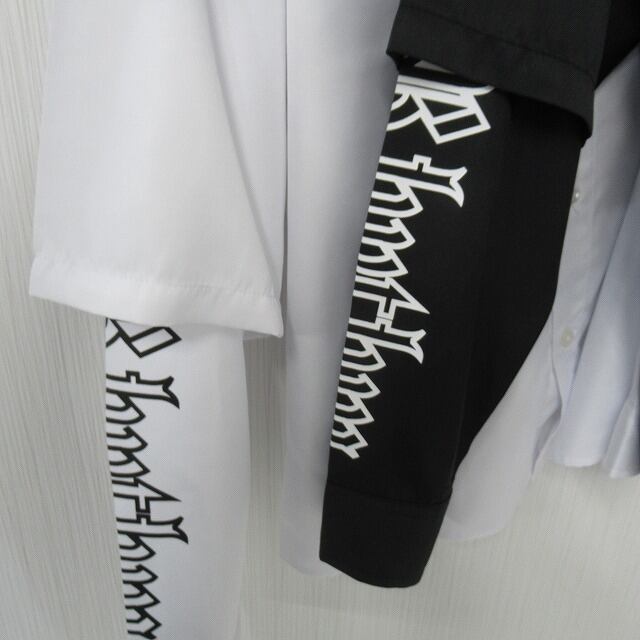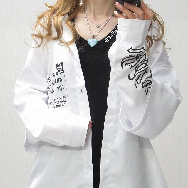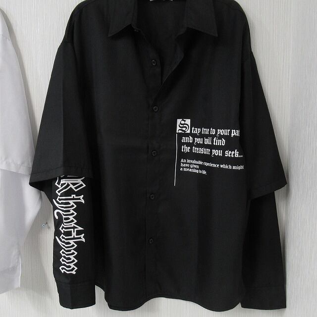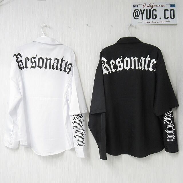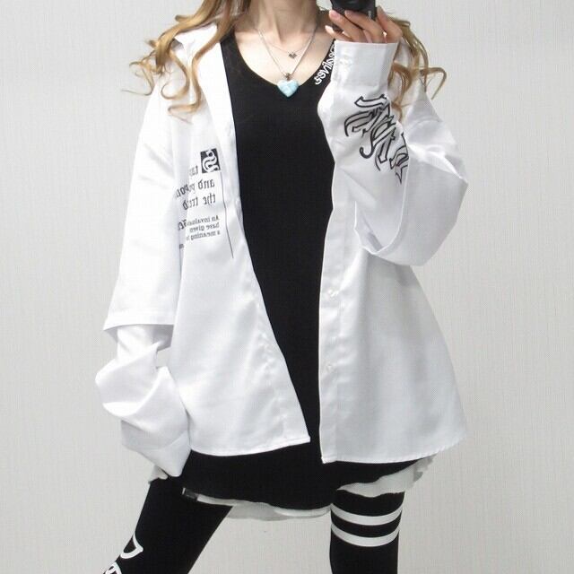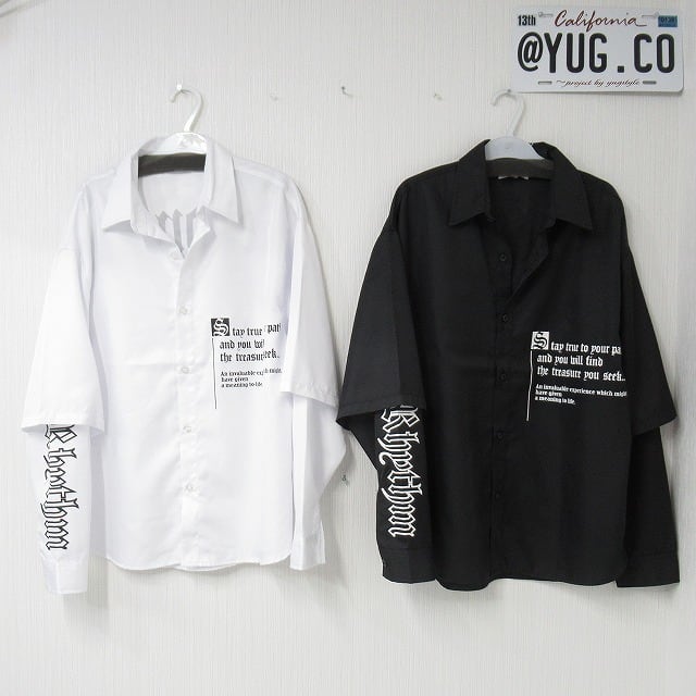 ストリート 袖ロゴ 重ね着 レイヤード バックロゴ 胸ポケロゴ BIGシルエット オーバーシャツ ホワイト