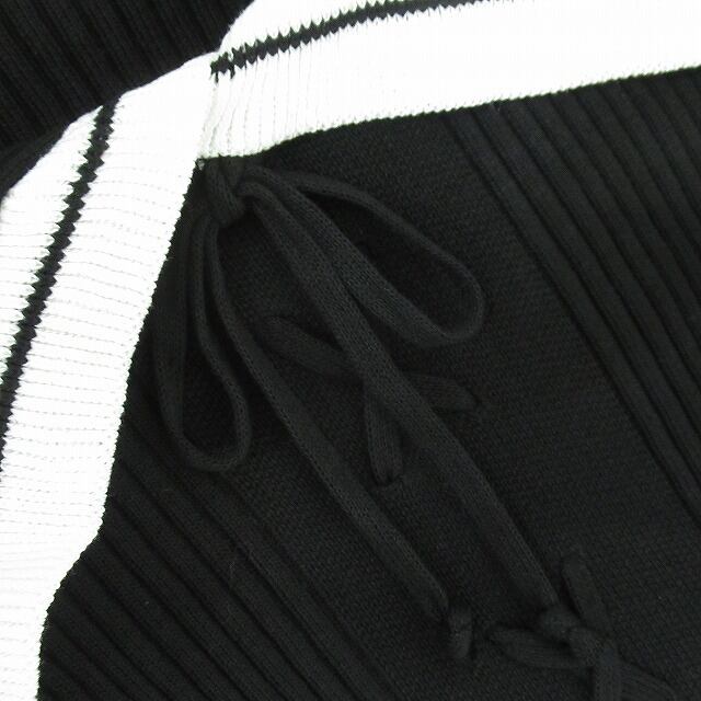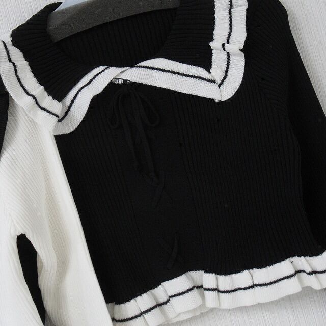 BIG襟 袖裾フリル Front編上げ バイカラー配色 リブニット Tops ホワイト