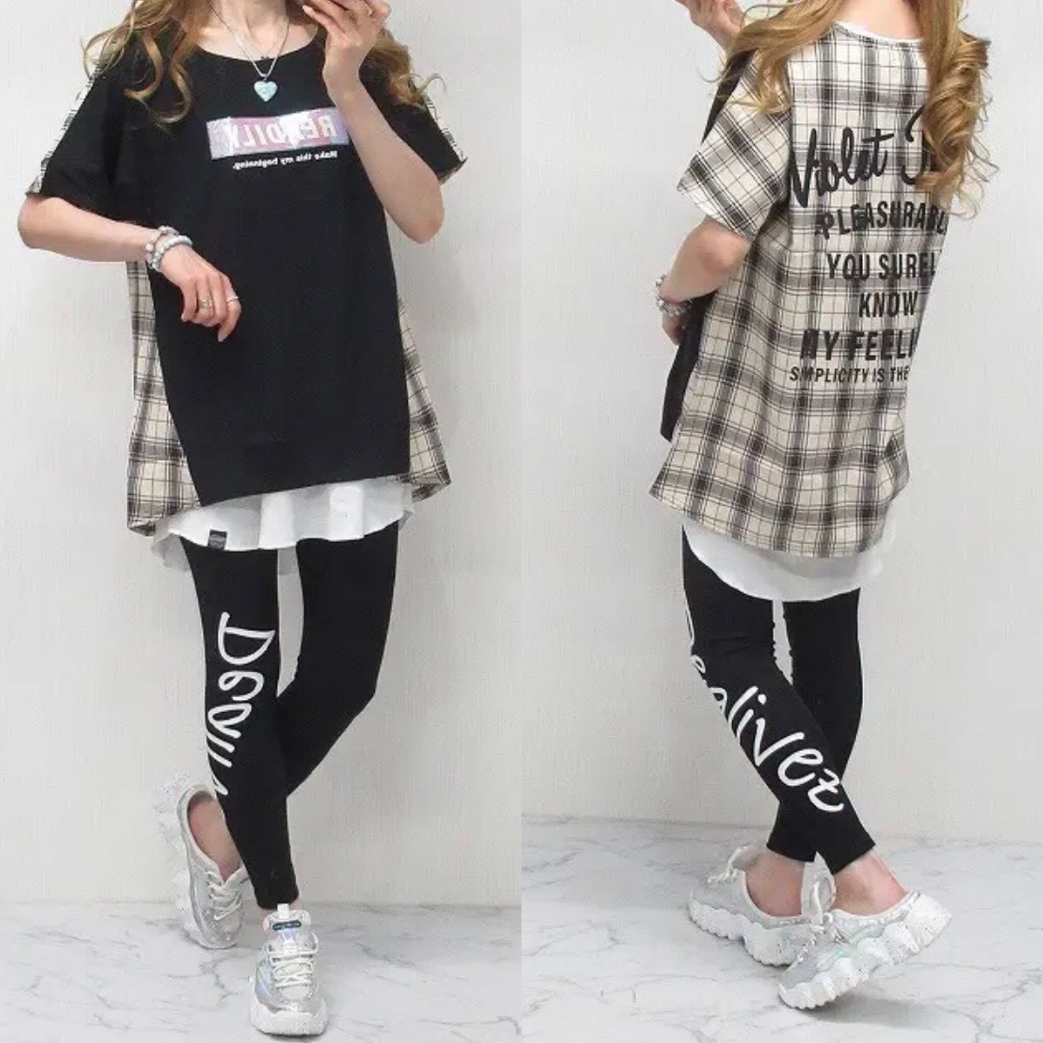 チェック柄切替 バックロゴ Frontオーロラワッペン チュニック Tシャツ ブラック