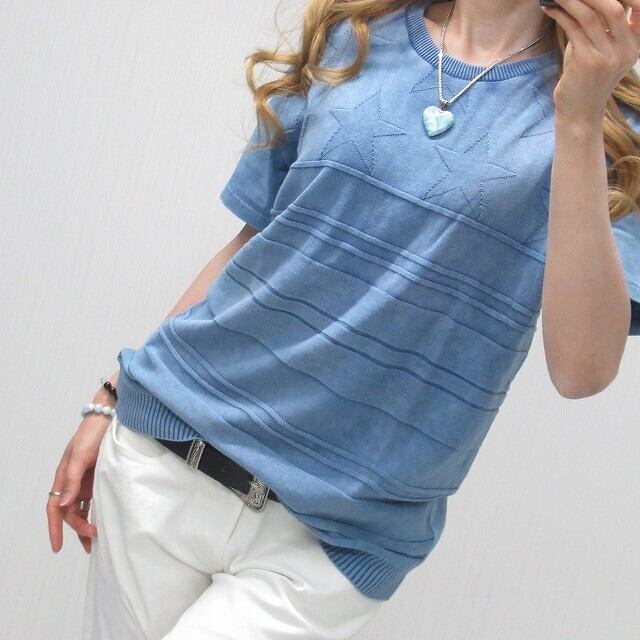 エンボス編み 星柄 ボーダー ビンテージ 綿100% ニット 切替 ドッキング Tシャツ ブルー