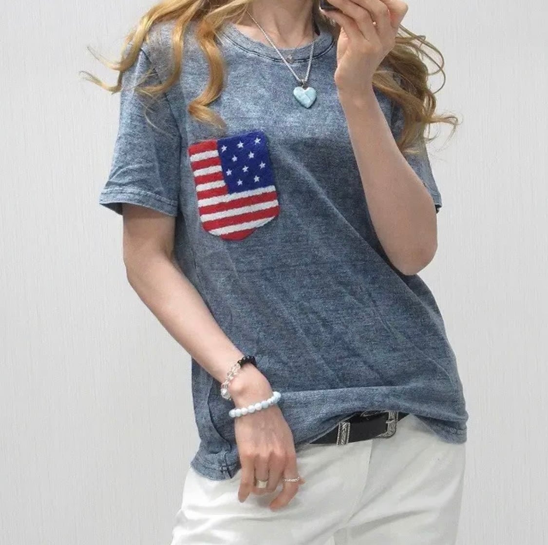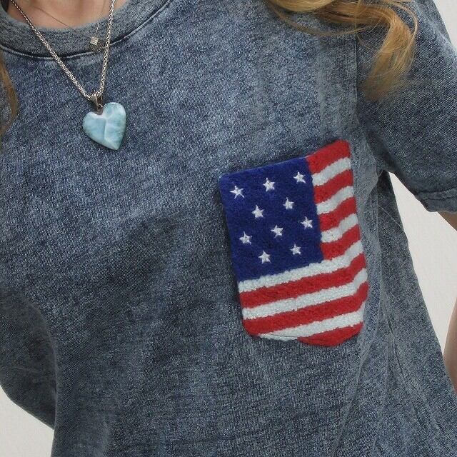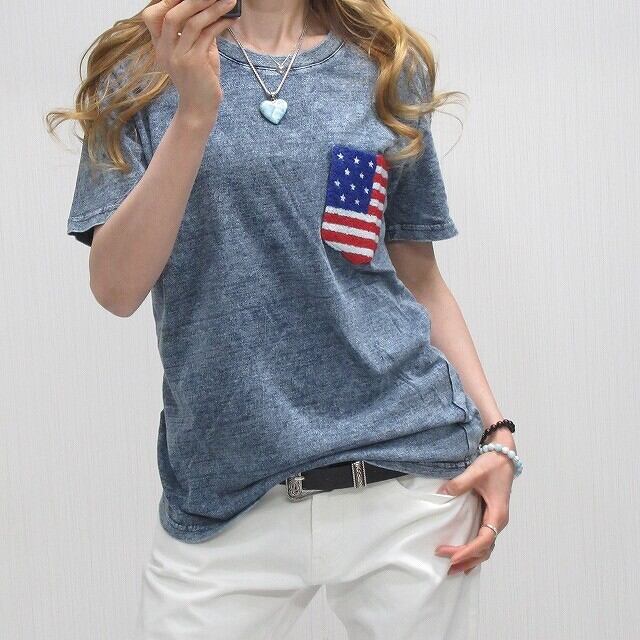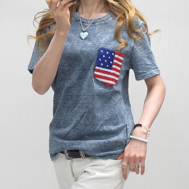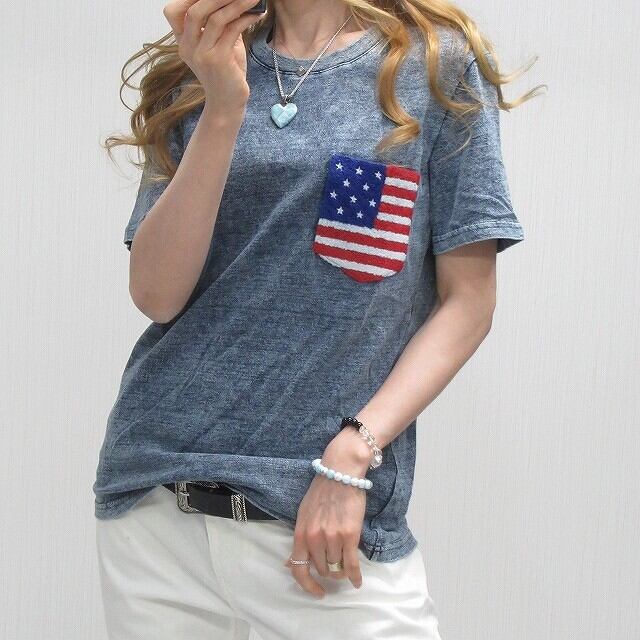 星条旗 サガラ刺繍 胸ポケット ケミカル ムラ染タイダイ デニム Tシャツ