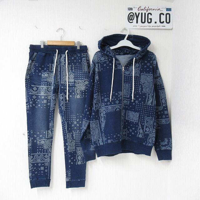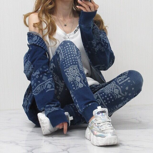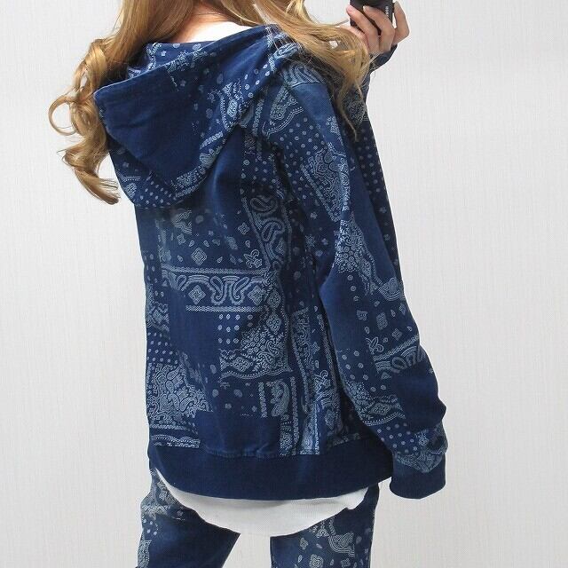 ペイズリー柄 ZIPパーカー カットデニム ブルー