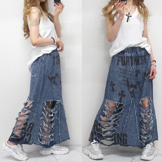スカル タトゥ デニムスカート ダメージ ロングスカート ケミカル