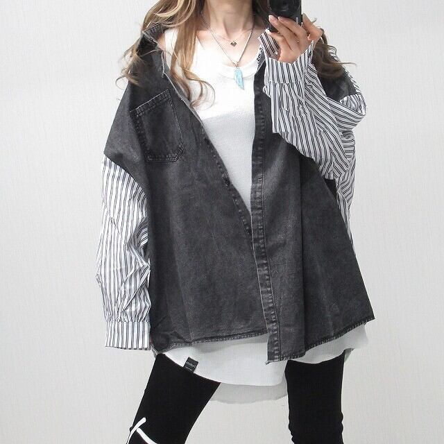 デニム切替ストライプ柄がオシャレ感抜群なオーバーシャツ♪