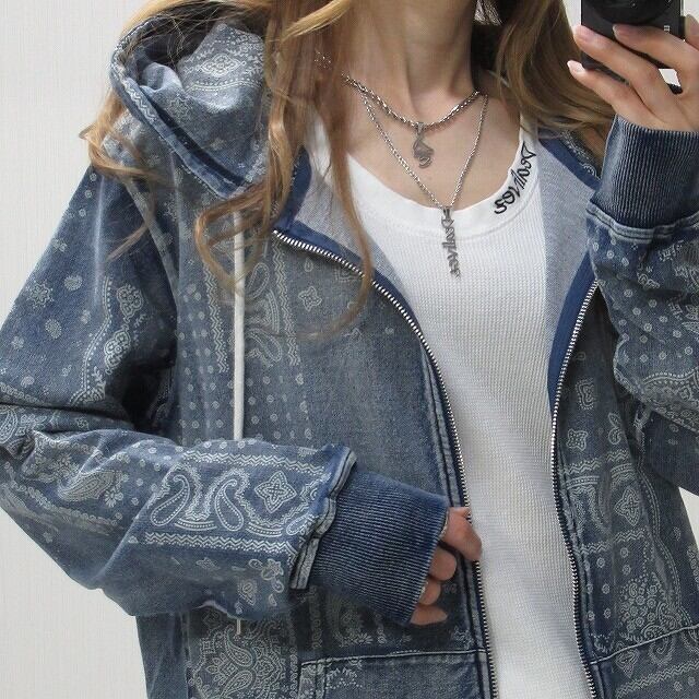 ペイズリー柄 ZIPパーカー カットデニム サックス