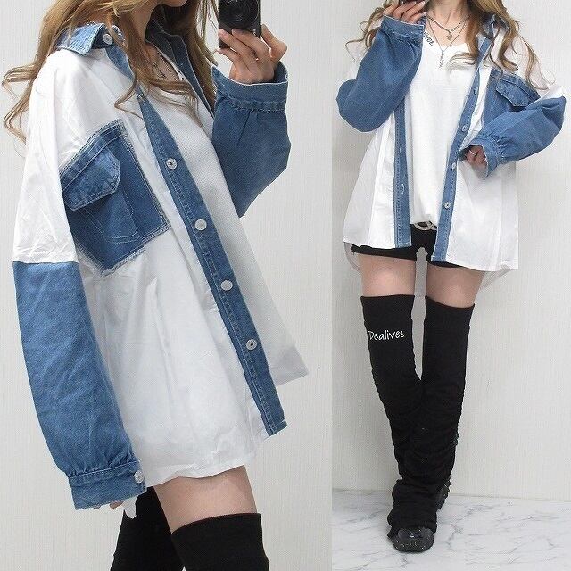 デニム切替 ドッキング パッチワーク風 デニムシャツ オーバーシャツ