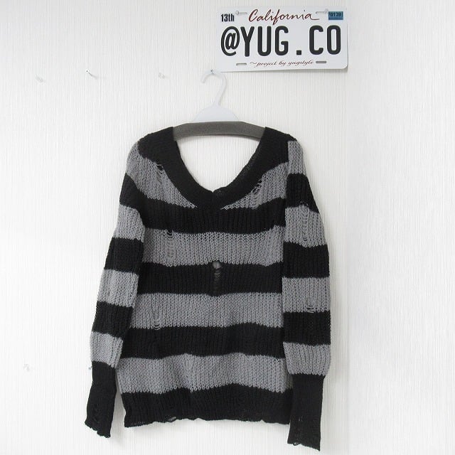 Vネック ダメージ ボーダー 配色 ゆるかわニット グレー