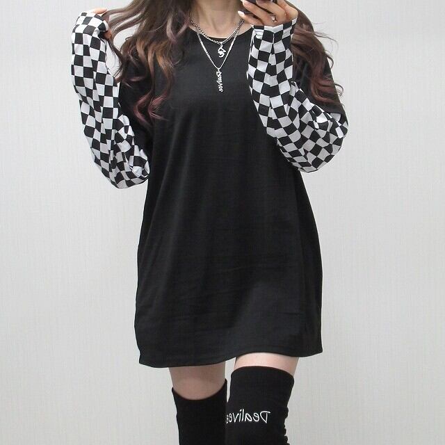 袖チェッカー ダイスチェック柄 配色切替 レイヤード重ね着 ロンT オーバーシルエット