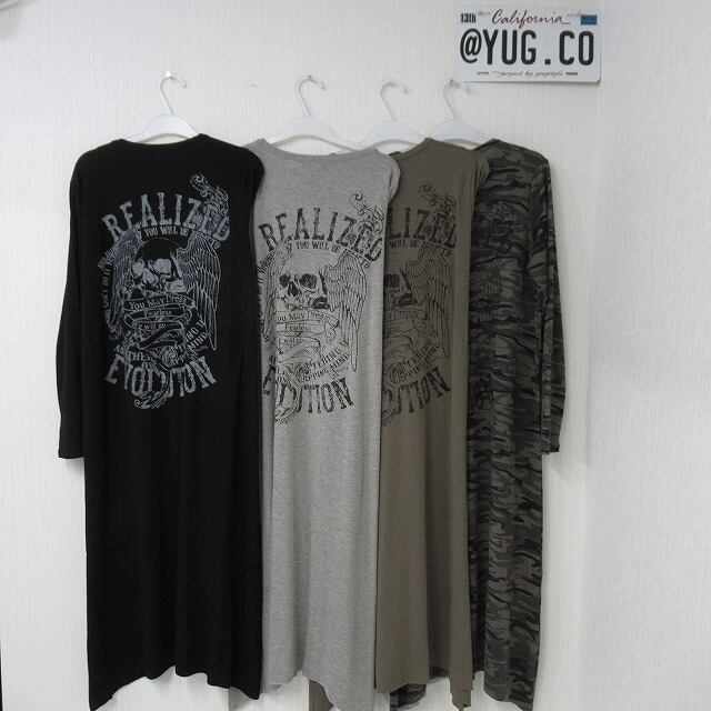 バックプリント スカル 裾アシメ タトゥ マキシワンピ ロングワンピース カーキ