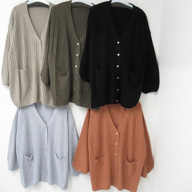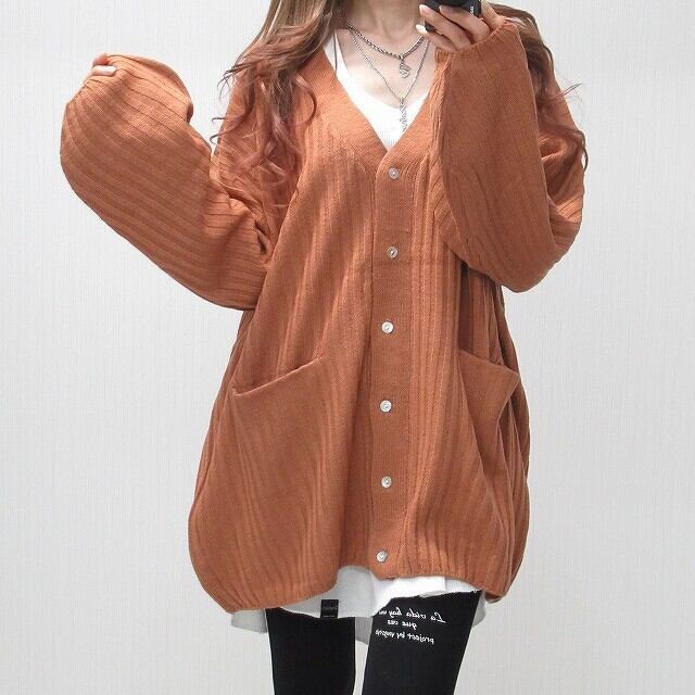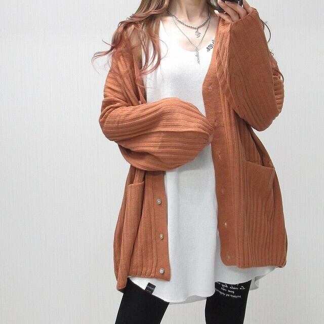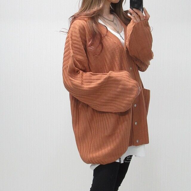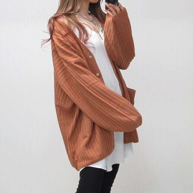 ストライプ編み リブ編み シンプル 無地 ニット カーディガン Front釦 サーモン