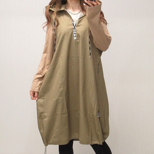 ハーフZip テープロゴ 袖切替 異素材MIX ぷっくり ロング パーカーワンピース ベージュ