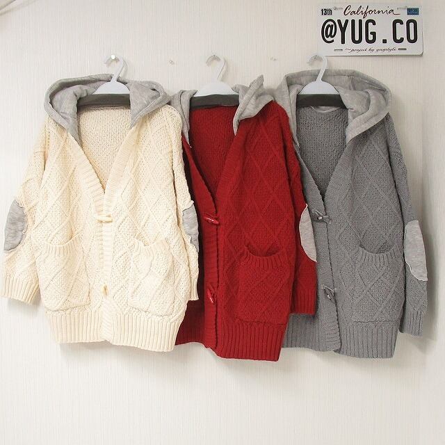スウェット切替 ダイヤ編み 肉厚ニット パッチワーク風 ダッフル ニットカーディ コーディガン ニットパーカー アイボリー