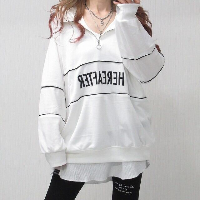 ハーフZip ハイネック パイピング ロゴ刺繍 プルオーバー ホワイト