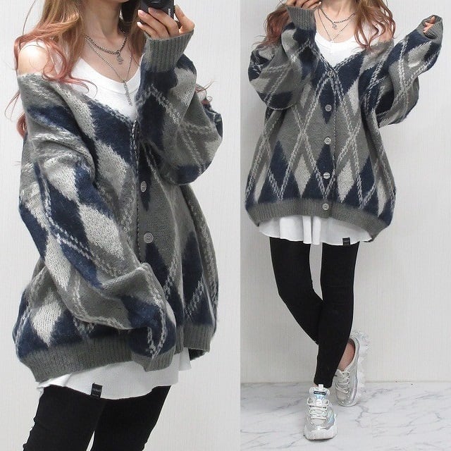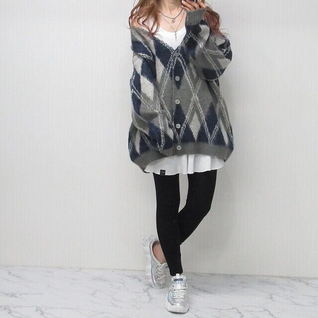 アーガイル柄 ぷっくり ニットカーディガン オーバーシルエット