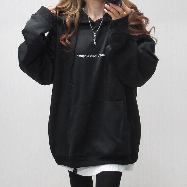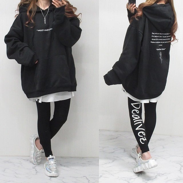 バクプリ薔薇 ローズ柄&ロゴ 裏起毛 Frontポケット オーバーシルエット パーカー ブラック