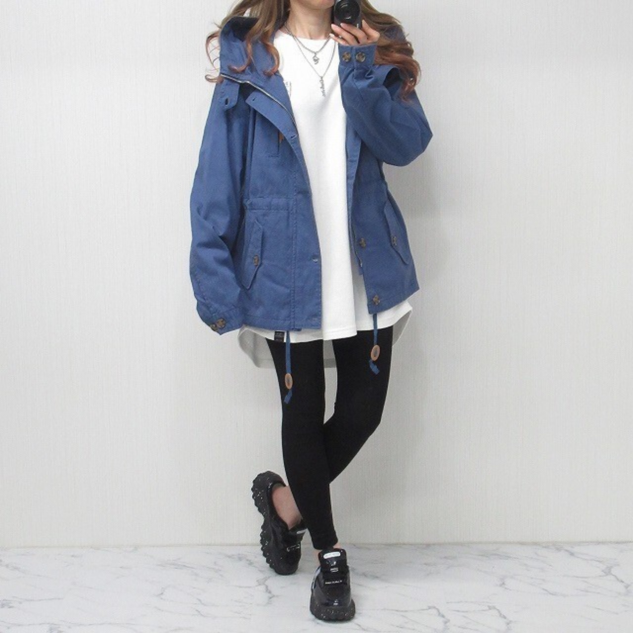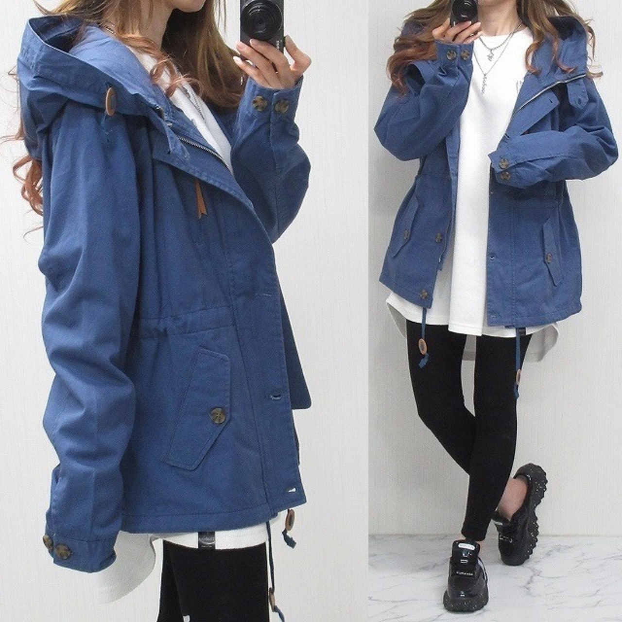 BIGフード 釦&ZIPWデザイン フェイクレザーアクセ ミリタリー コート ジャケット ブルー