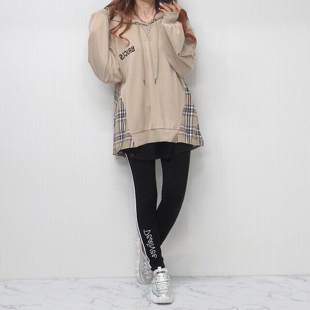 チェック柄切替 Back 布ワッペン貼付 バーコード&ロゴ パーカー ベージュ
