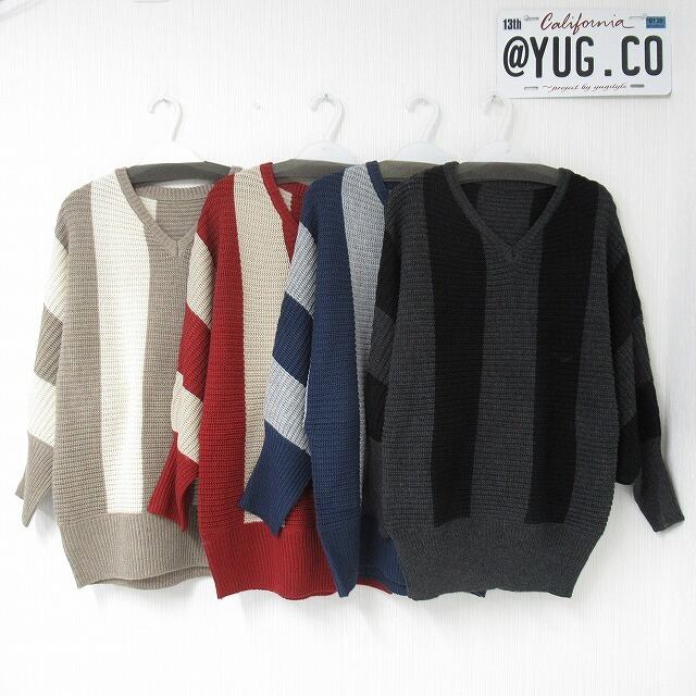 Vネック ストライプ配色切替 バイカラー ドルマンニット ボルドー