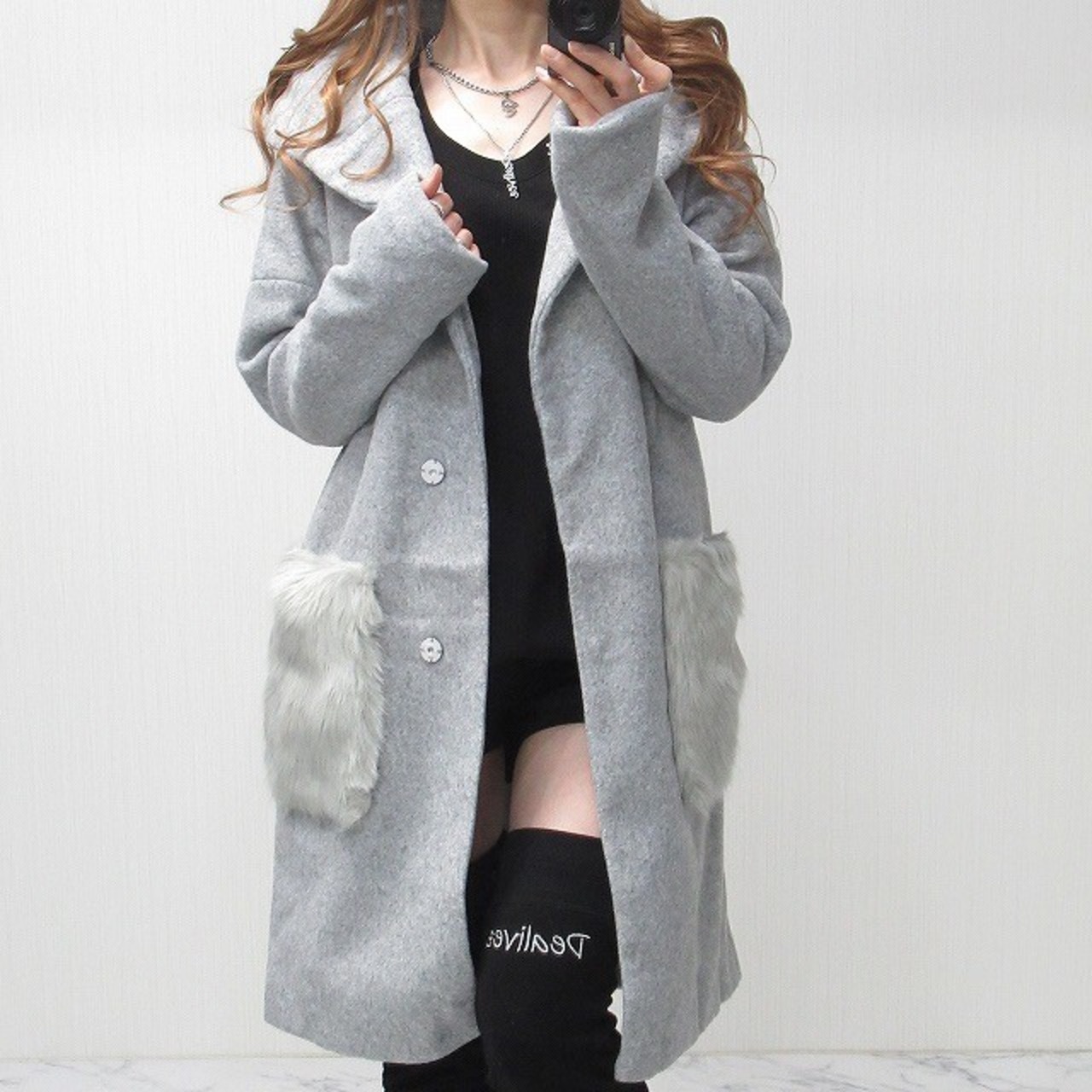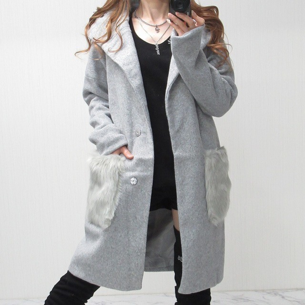 ボリューム◎ファーポケット付き BIGフード Front釦 キレイメ コート アウター グレー