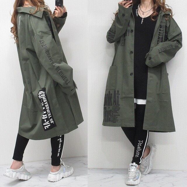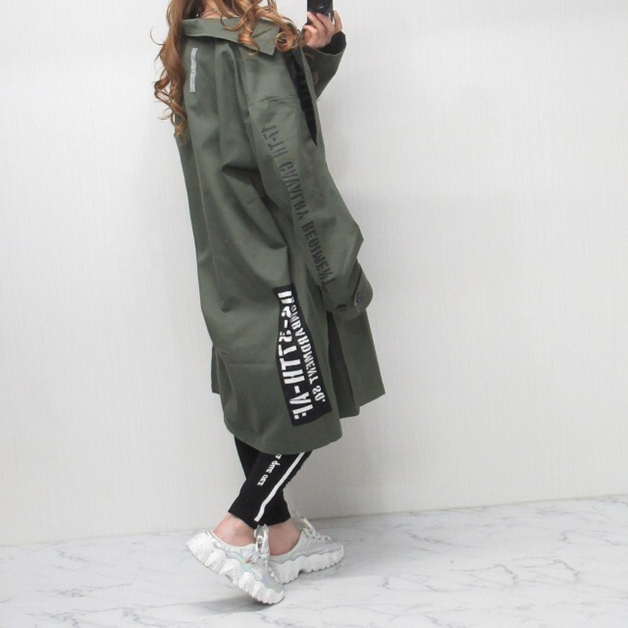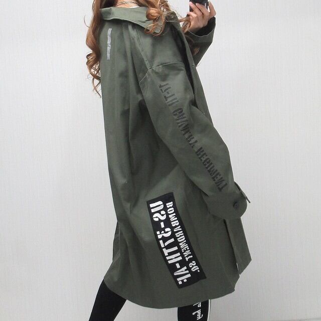 ストリート Front 袖ロゴ Backリフレクタ ミリタリー ロングシャツ ジャケット BIGシルエット カーキ