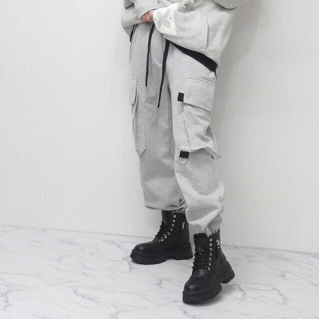 Side立体ポケット ストリート Backロゴ 裾ZIP カーゴパンツ Wideスウェット BOYSパンツ グレー