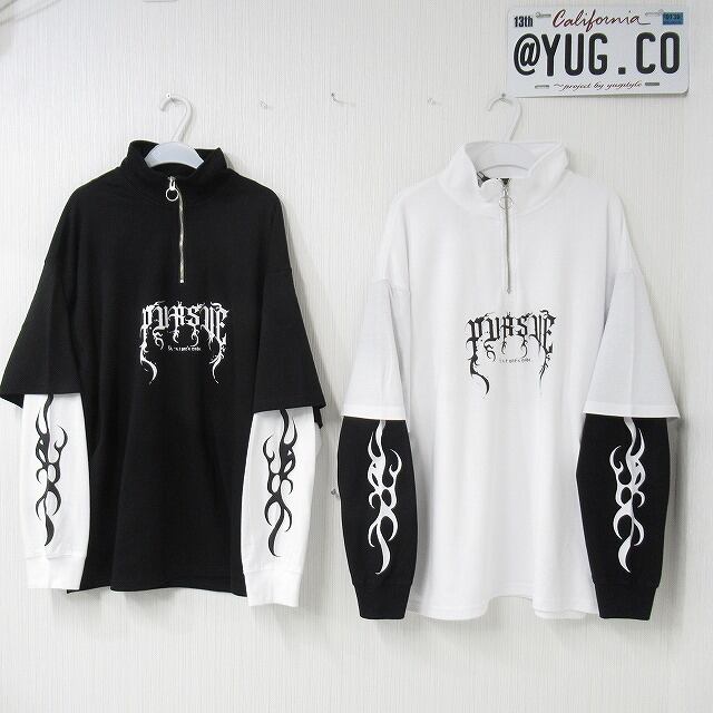 トライバル ハーフZip ハイネック 袖レイヤード 重ね着 プルオーバー ブラック