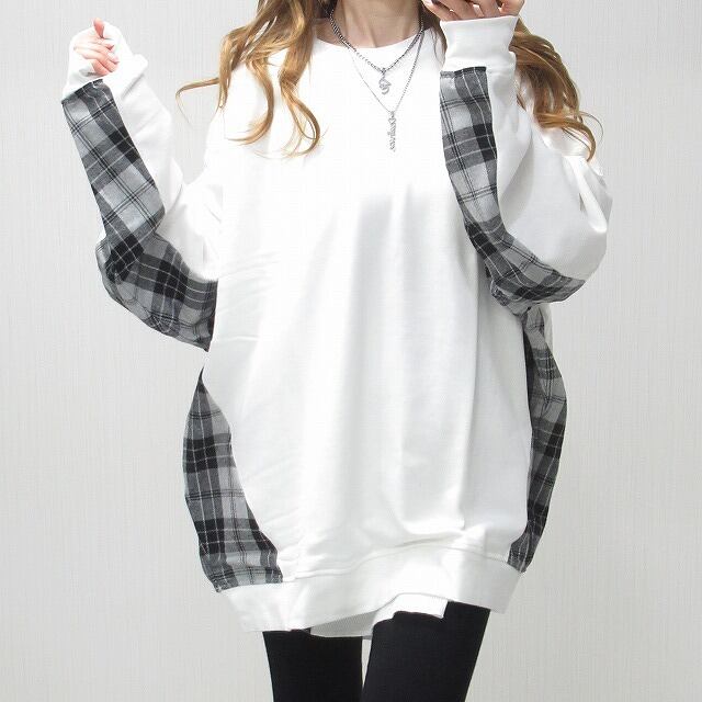 Sideチェック柄 切替 BIGトレーナー プルオーバー ホワイト
