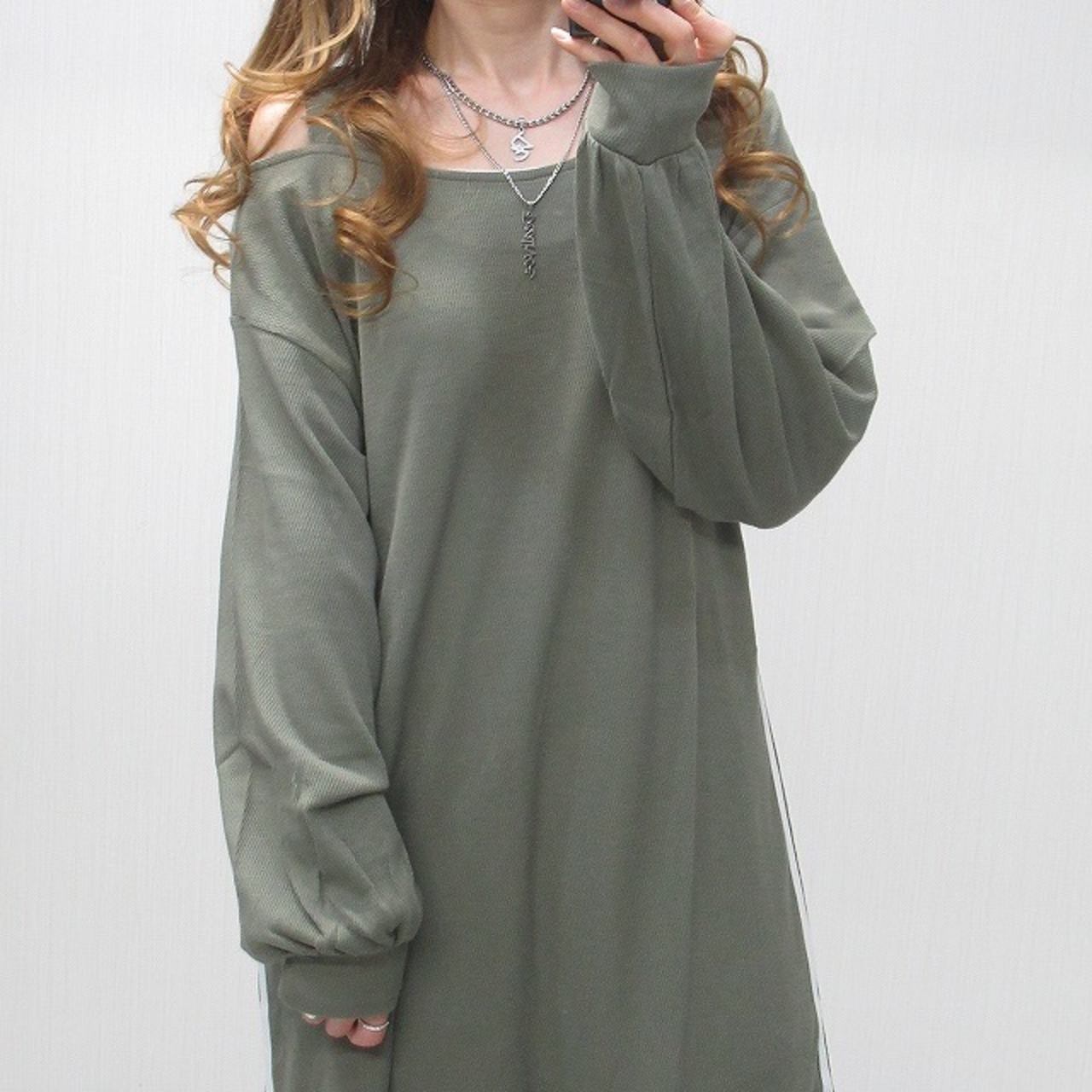 肩あき 肌魅せ SideWライン 美 フレア ロングワンピース カーキ