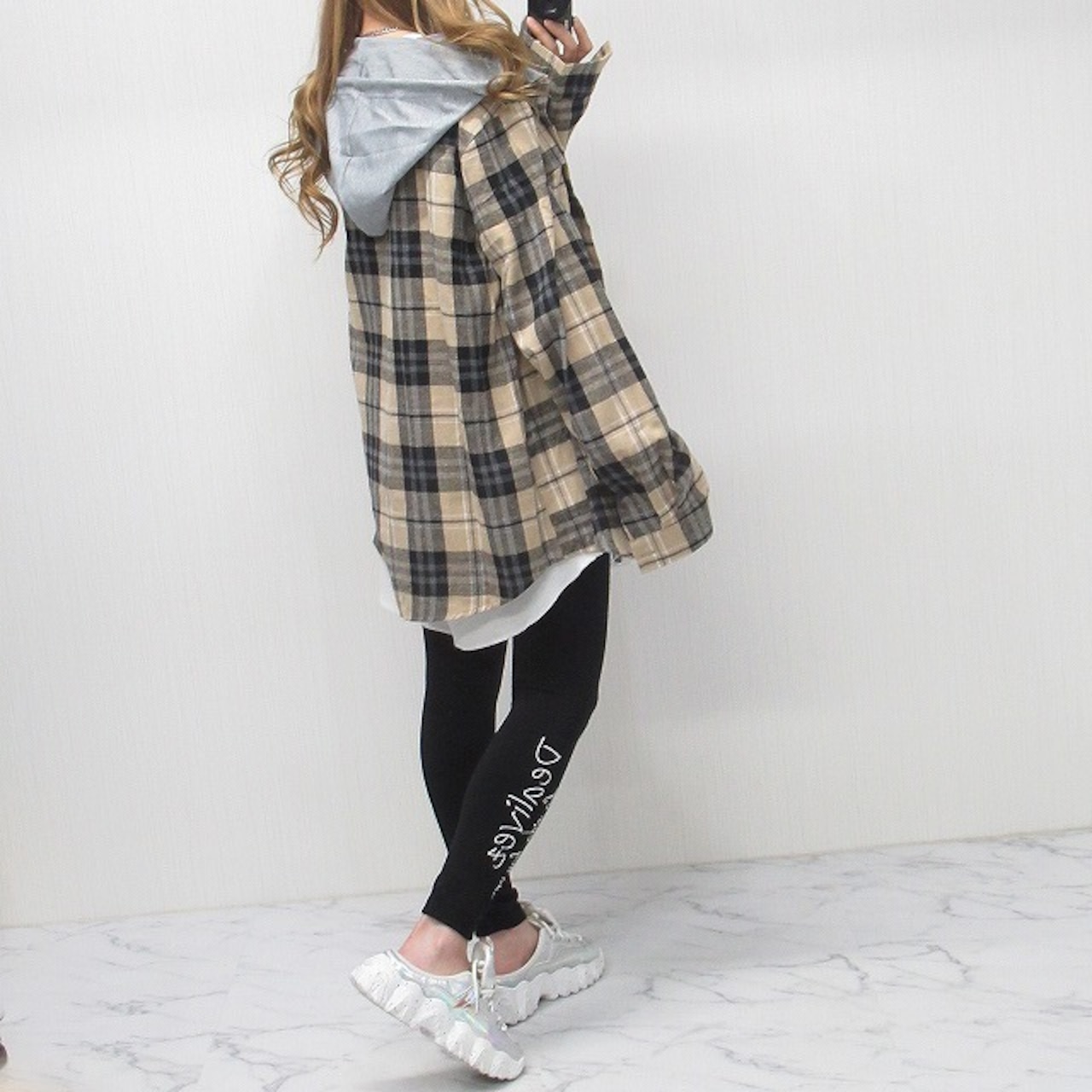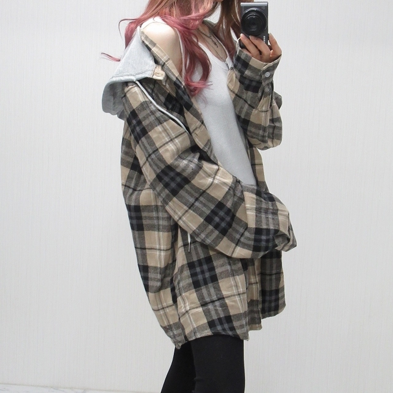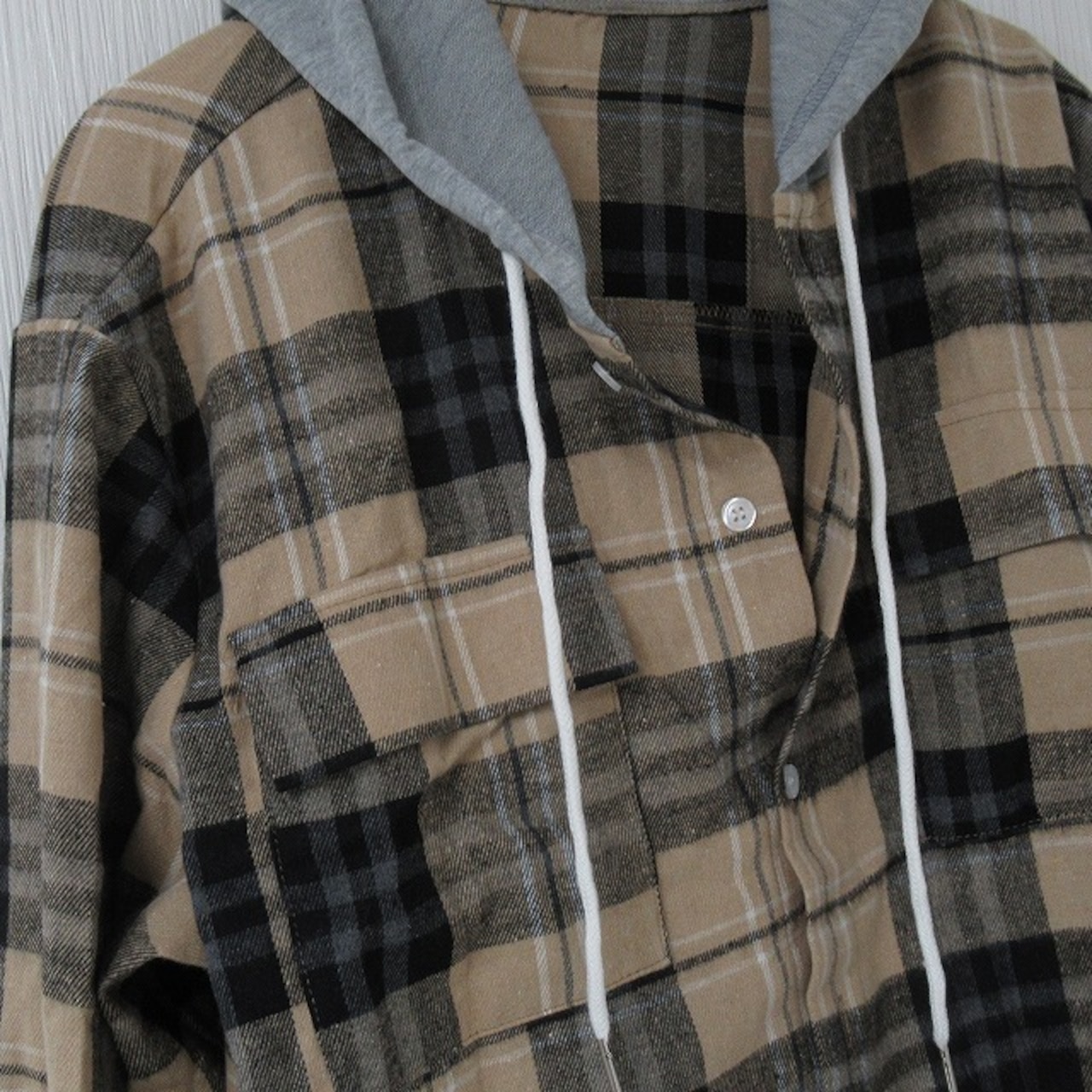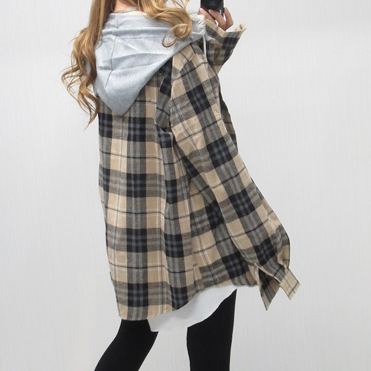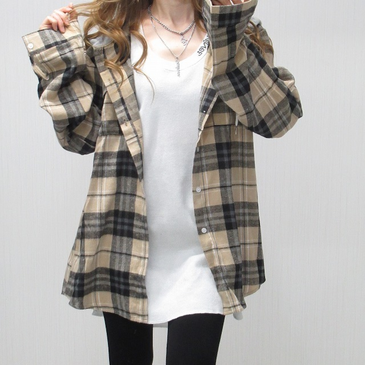 チェック柄 フード付き 異素材MIX BIGシルエット オーバーシャツ ベージュ