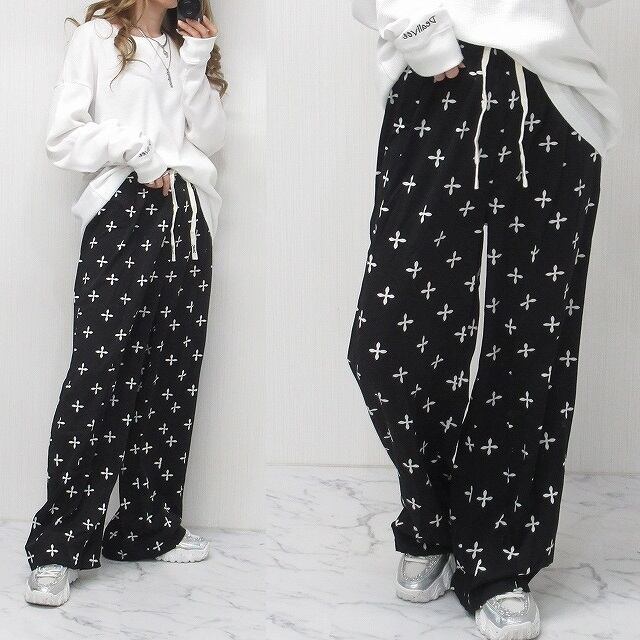 クロス柄 モノグラム ワイドパンツ ゆったり カジュアル
