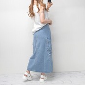 Frontスリット Side立体ポケット カーゴ風 デニムスカート ロングスカート ロンスカ サックス