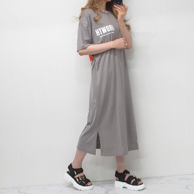 バック刺繍ワッペン Tシャツワンピ ロングワンピース グレージュ