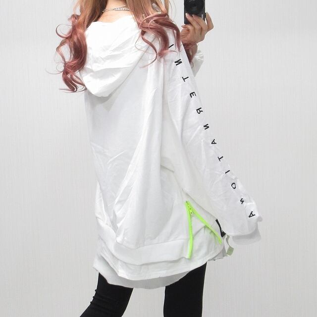 ストリート SideスリットZIP 開閉OK 袖刺繍 重ね着 レイヤード パーカー ホワイト インポート