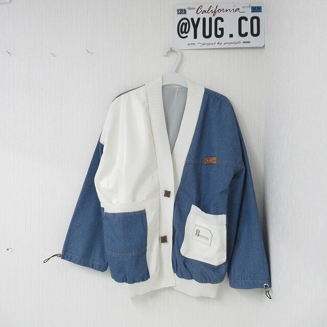 デニム切替 フェイクレザー リブ ドッキング カーディガン