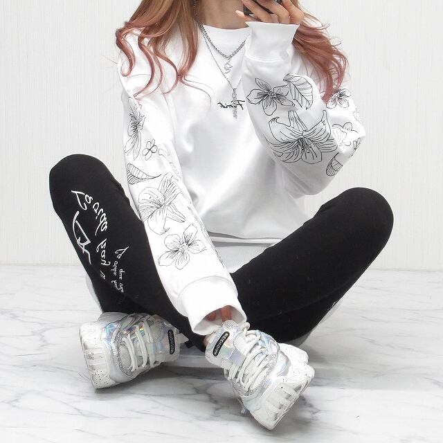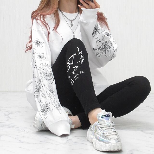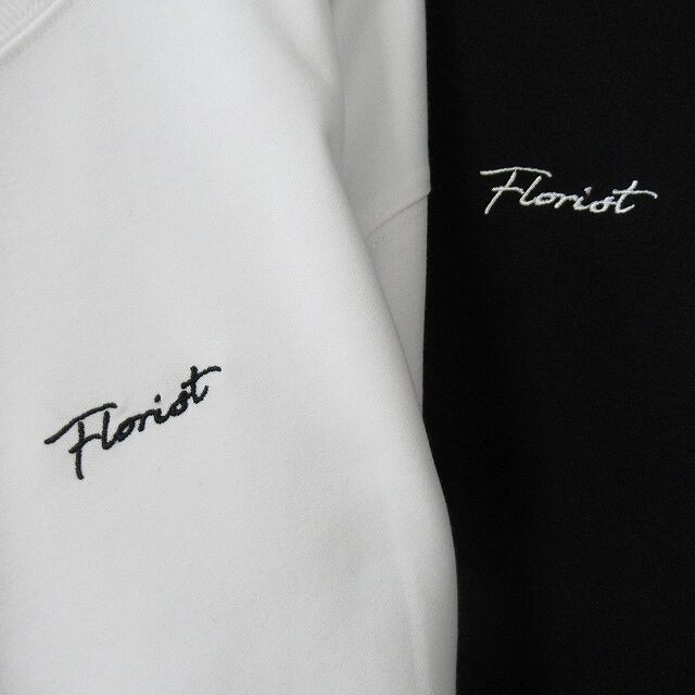袖Frower 花柄刺繍 バイカラー モノトーン 上品 トレーナー オーバーシルエット ホワイト